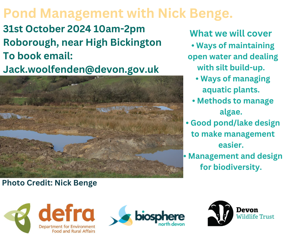 Pond Management with Nick BengeNickSep 25, 20241 min readUpdated: Oct 31, 2024On Thursday 31st October, 10:00 - 14:00To book email: Jack.Woolfenden@devon.gov.ukPlease note that places are on a first come, first served basis